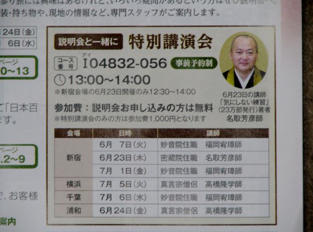 今回は、完全に告知でございます。6月23日(木)。12時30分~14時。クラブツーリズム(新宿アイランドウィング:西新宿6-3-1)で、講演会があります。事前予約が必要で電話番号は03(5323)5588(クラブツーリズム お遍路)。コース番号はI(アイ)04832-056。参加費1000円。残り10名さま。腕によりをかけ、体にしなを作っての90分の法話。あはは。お時間がある方はぜひどうぞ。
