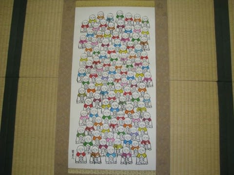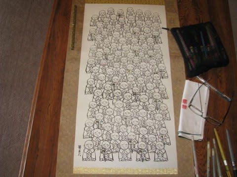 「住職、スーパーはありがたいよ」と檀家のお嬢さんが玄関に入ってきた。訳をたずねると、スーパーの花屋さんの店頭に「彼岸の入(い)り17日、中日(ちゅうにち)20日」と大きく書いてあったのだそうだ。おかげで、忘れないで今日おまいりができたというわけである。あはは。私は日がな一日、玄関番をしながら「地蔵だらけ」の制作に勤(いそ)しんだ。かつて30本も大人買いした(書き損じたら一貫の終わりになる)”イッパツ”の軸も残り一本になった。