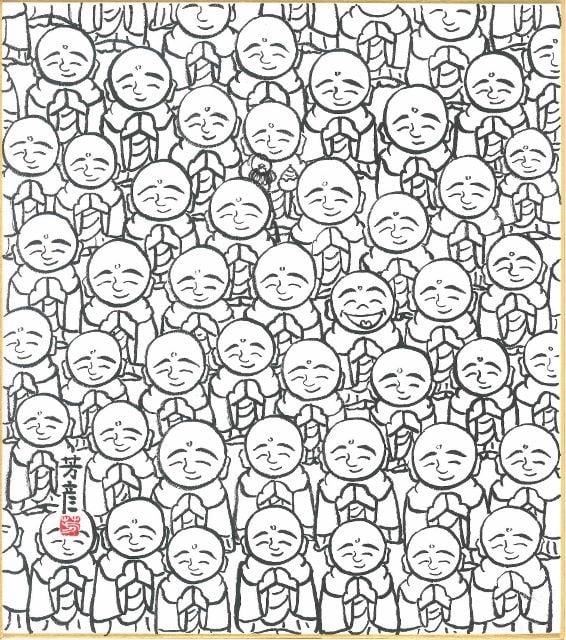 今日、弘法大師のご命日、密蔵院では午後二時から「読経の庭」、明日は午後1時~3時、午後7時~9時が「写仏の庭」です。いくつかのパターンで描いたお地蔵さまの色紙も、ついに包装紙みたいなパターンになった。あはは。お顔を半分にしたり、体を半分にするのは気がひけたが、無数をあらわしたかったので、こはこれで仕方がない。※写真をクリックすると大きな画面になります。