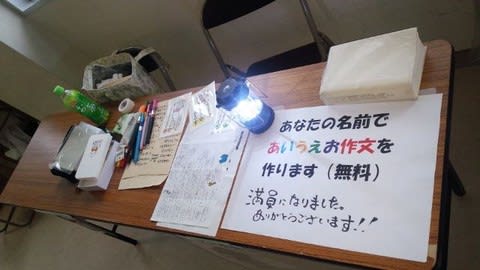 今日はかつてPTA会長を努めた小学校のバザー。雨天のために校舎内での開催となった。15年以上「お名前拝借あいうえお作文(無料)」で参加させてくれている。結構人気のあるブースで開始から15分で40名の枠が一杯になった。開催時間中には書き切れない分をお寺に戻ってきてから書いている。お受けできなかった皆さん、ごめんなさい。申し込んだ方でまだ受け取っていない方は、お寺に取りにきてくだせぇ。ぐはは。
