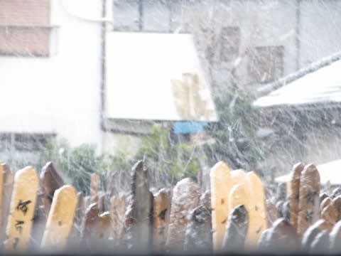 雪の予報だから、ほとんどお参りの人は来ないだろうと、客殿を使ってお地蔵さまの「言いたい放題」ポスターの文字を書きはじめた。しばらくして住職室へ行くと、窓の外はジャカスカ雪が降っている。「これなら今日は誰も来ないだろうから、ジャンジャカ書くぞ!」と思った・・・ムッ?「ジャカスカ」と「ジャンジャカ」は今日の状況では、どちらも使えるだうかと思った。調べて見ると「じゃかすか」は〔勢いよく物事をするさまを表す語(金をじゃすか使う)等」だから、雪でもポスター書きでも使える。しかし、「じゃんじゃか」は〔楽器などをうるさく鳴らすさま〕とあるからダメだ(雪は音をたてないで降っているからだ)。で、気がついた。もう一つ私が使いたかったのは「ジャンジャン」だった。「じゃんじゃん」は〔同じ物事を続けざまに勢いよく行うさま〕とある。バッチリだ。今日の雪と文字書きの形容副詞は「じゃんじゃん、じゃかすか」がぴったりである。ムッ?バッチリとピッタリ?あはは。今日はもうやーめた。