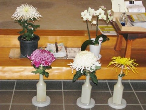 趣味で菊作りをしている檀家さんが、一年間丹精をこめて咲かせた菊で玄関を飾ってくれた。お寺にやっくる人をもてなすためでもあり、本尊さまへやお墓の中にいる人たちにとっては供え花でもある。