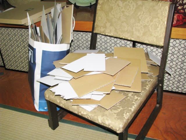 住職室で原稿を書いていると、部屋の外から家内が「はい、あなたの好きな段ボールよ」と、まるで犬に餌を与えるような言い方をしたので苦笑して廊下へ出た。見ると、つぶされていない箱がどっさり置かれていた。たしかに目下の所、私は段ボールは好きなので裁断まではした。しかし、いくら好きな餌でもこんなには食べられない、描いていられないと思った。一昨日に裁断した分を含めてゆうに200枚以上ある。今日は資源ゴミの日なので、膨大な量の段ボールの切れ端を箱に詰めて出した(その写真のほうがインパクトがあったと思うのですが、もう収集されてしまったので写真を撮れませんでした)。清掃局の人は「このゴミを出した人は段ボール用のシュレッダーを持っているのだろうか」と訝(いぶか)しがったに違いない。あはは。