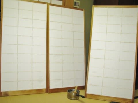 ドッグフードがなくなりそうだから「ホームセンターへ行ってくるよ。他に何か買うものは?」と言った。すると家内が「障子紙買ってきて」と言う。思わずニヤリと笑った。数日前に「1月の護摩(20日)までに二階の客間の障子を貼り替えて」と頼まれていたのだが、家内の言葉はその件と密接にリンクしているのは明白だったからだ。原稿の展開にも行き煮詰まっていたので、障子を貼り替えることにした。専用の糊も売っているが、ここ数年は余ったご飯を煮て糊を作ることにしている。作ってみたら、ノリノリで作ったわけでもないのに、家じゅうの障子が貼り替えられる多量の糊ができてしまった。数年に一度しか作らない罰である。ぎゃはは。貼り替えたあとは霧吹きをして完成である。