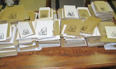 今朝は今年はじめてのリサイクル資源回収の日。段ボールも地球規模の重な資源である。だから、段ボール地蔵用の紙の切り落としを出した。お地蔵さまが描かれた切りとどめ置かれた段ボールを重ねてみたら、けっこうな量になっていた。 ざっと300枚以上あるだろう。あとは、言葉を入れてビニール袋で包装すれば、どこへいくかは風まかせである。むはは。