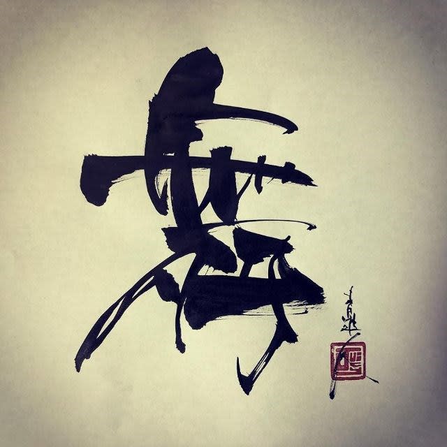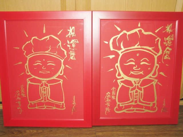 この10年ほどで、すっかりヤンチャの角が取れた飲み仲間のデザイナー(書家?)の岡本晃典こと、ジューシー。彼の文字は絵というか詩のようだが、何が好きと言って「何という字かわかる字を書く」ということである(写真は感と舞)。あはは。私と家内の還暦のお祝いに夫婦(めおと)地蔵(布袋?)を描き下ろしてくれて、大阪から送ってくれた。赤と金で、まるで台湾みたいな配色だがこれも長寿、福寿を象徴しているのだろう。ジューシーらしい温かい気持ちが嬉しい。