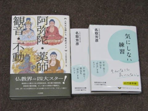 昨日も今日も、ポストの中に書籍用封筒が入っていた。昨日の封筒の中には『気にしない練習』(52刷)の筆者贈呈分が入っていた。これほど大勢の方に読んでもらえるのは、日常に落しこんだ仏教をお伝えしたい坊主として、とてもありがたい。そして、今日のそれには大法輪閣(出版社の名前です)の『阿弥陀・薬師・観音・不動~仏教界の四大スター!~』が入っていた。月刊誌(隔月誌?)の『大法輪』の特集「早わかりガイド」として二回に分けて掲載されたもの一冊にをまとめたものである。29人の筆者の集大成だ。私はお不動さまの「よくある質問」コーナーを担当。姿形の説明だけでなく、私が提案した「なぜ入れ墨に不動明王を入れるのか」なーんてぇのも入っている。あはは。書店でお見かけの際は、手に取ってご笑読いただければ幸いです。