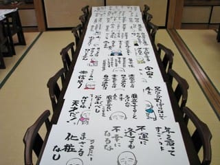御詠歌のお稽古も夏休みがおわって今日からスタート。終わって客殿が空いたので、掲示板用のポスター書き。3時間かけて120枚くらい書いただろうか。この景色もまた壮観である。家内も長男も「そんなに書いてどうするの?」という顔をしているから「私が死んでも、1年間くらいは掲示板を貼り替えられるように書いたのだ」と半分本気、半分冗談で言った。言ってから、死んだ後のことまで指示を出すのは、我ながら余計なお世話だと思った。そういえば、最後に書いた言葉は「他人があなたに関心をもたなければならない理由は、残念ながら、ないのです」だった。ぐはは。