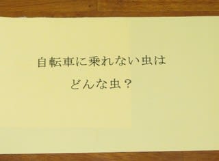 7月13日、東京盆は涼しい朝でスタート。お盆らしいかどうかわからないが、掲示板の言葉は“家族系”の「泣き」と「笑い」を一枚ずつ書いた(写真)。そして、毎月曜に変える掲示板、今週の「なぞなぞ」は、[自転車に乗れない虫はどんな虫?]である。ブログにアップする掲示板の「なぞなぞ」の答えがぜんぜんわからない人がいるらしいので、今回はヒントつき。あはは。[自転車に乗るにはペダルをどうにかしないいけないのですが、それをしない虫がいるのです」。