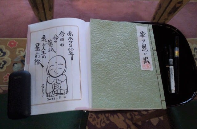 10年ぶりに石巻へ。震災の翌年に石巻に移住した若い友人、カメラマンのけーすけ(平井慶祐)が10年取り続けてきた写真の展示会『10年の幸福写真』をやるというので陣中見舞いである。一年半以上旅行に行けていない家内も連れだした。彼が10年間で切ったシャッターは10万回(40万回だっけ?)、その中から約3400枚をプリントして「欲しい人には差し上げます」という太っ腹な企画。”苦しみを減らしたり 悲しみを無かったこのにはできない けれど 喜びを増やすことはできる 「幸福写真」を撮りましょう”--そんな実行委員会の素敵な思いを心に染み込ませて、宿に入り、ラウンジに置いてあった「旅の思い出」帳に記帳し、帰宅した。写真は現在の石巻と「旅の思い出」。