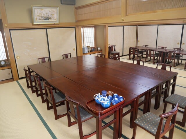 今日の午後4時からは「法話の辻」。4時~5時は私が本堂でしゃべるので、5時からのフリートーク会場の設営は家内がやってくれる。昨日テーブルを8個合体させて用意したつもりだが(写真上)、心配性の家内が「もう少し入れるようにしておこうよ」と言う。そこで、さらに4個加えて巨大なテーブルができあがった(写真下)。この上で床運動か柔道ができるほどの広さである。二人で作り上げた巨大構造物に夫婦そろって酔いしれていると、家内が言った。「でも、これじゃ、テーブルの中のほうを拭けないわね」。ぎゃはは。私は「拭いてから合体させたんだから、もう拭かなくていい」と知らん顔をした。えへへ。