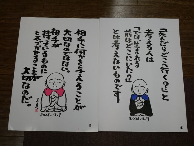 「ハルメク」ウェブ版の人生相談の回答を書いていると、後ろで寝息がする。「なんだ?」と思ってふり返ると、家内が命名した通称“出待ち”の犬。待ちくたびれて眠ってしまったらしい(写真)。この犬は己に必要なものはすべて内蔵していると思う。そしていつか、生れる前にいた世界に戻るのだなと思った。もう一枚の写真は、境内掲示板に貼った言葉二つ。