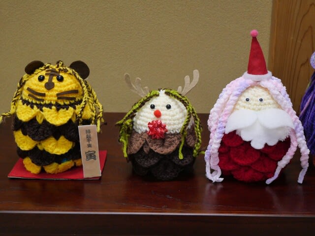 夜の部の「写仏」にお越しになるのは83歳のSさん。手編み・手作りのアマビエを初めて持ってきてくれたのは今年の夏前だった(5体バージョン写真右端)。くちびるがすさまじくカワイかった。秋になって、ハロウィーンバージョンがやってきた(写真右から2番目)。ともに玄関でお墓参りの方々にご利益を授けてくれた。昨日、新しい三匹(?)の仲間がやってきた。Sさんのアイデアの素晴らしさに思わず拍手した。写真左端は来年の干支のトラである。どれもUFOキャッチャーの景品にしたらどうかと思う。