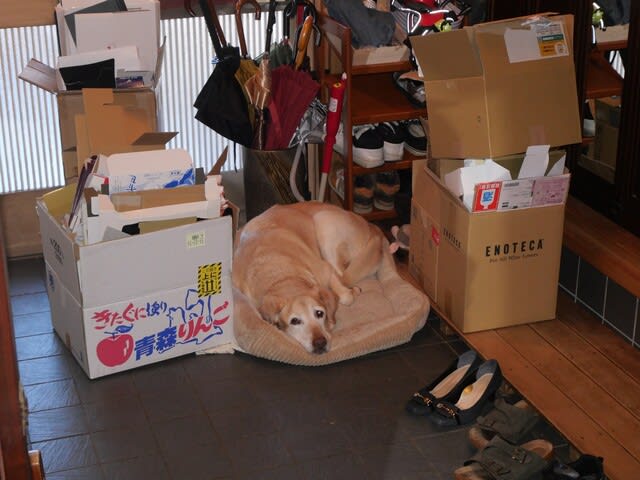 ご詠歌やお昼ごはんだとバタバタお寺の中を動いて、通りすがりに何気なく玄関を見ると、明日出す資源ゴミの間で犬が寝ている(写真)。呆れて、「台所にも廊下にも、お前用のムクムククッションがあるのに、一体何が悲しくてそんな所で寝ているんだ」と言ったが、恨めしそうに私を見つめるだけである。「この段ボールゴミ、邪魔なんだけど・・・」と訴えているのかもしれない。あはは。