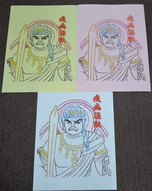 ウェブで見つけた緋色 史恵さんの迫力満点の疫病退散不動明王イラスト(白黒写真)。自分で色分けして描き直してみたが、白地だと面白くない(そういう問題ではないか・・・)。A4 サイズのイエローとピンクのコピー用紙にプリントしたら(三枚写真)、拝んだ後に掲示板に貼ってもいいかなというレベルになった気がする(原作の迫力にはかなわない。どはは)。