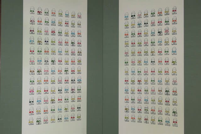 個人的な弘法大師ご生誕1250年記念事業としてお地蔵さまを1250体描いて屏風に仕立てる。一曲96体×2枚で一つの屏風に192体だ並ぶ。屏風職人さんの話では、簡単に持ち運べる軽い屏風だと、裏打ちした紙が時間がたつと剥がれる可能性があるとのこと。いまさらそんなことを恐れていては話にならないので「とりあえず一曲仕立ててください」と依頼していたものができあがってきた(写真)。残りの6曲もゴーサインを出した。10月末には7曲の屏風が並ぶ。楽しみである。むはは。