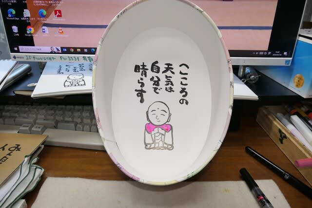 大行事の護摩を明日に控え、廊下を通ったらマドレーヌの入っていた楕円形の空箱が置いてあった。底が白いので、何か描けば3Dっぽい素敵なナニモノかになる気がして住職室に持ち帰った。10センチほどの高さの縁から筆ペンで描くのは想像より難しかった。このまま置くと、ゴロンとなってしまうから、百均で紙粘土と人工芝を買って下部に詰めれば・・・。明日大行事なのに、そんなことをしている暇はない。あはは。