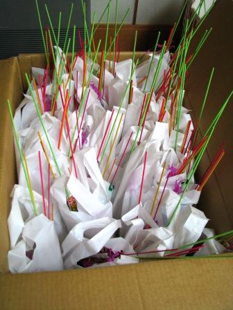 お盆前の恒例行事、花火詰め作業。100セット。11種類入る。