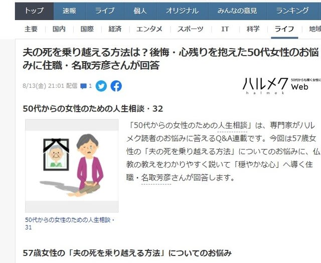 ハルメクweb8月号の人生相談はご主人を亡くした方からのご相談。2月号から回答させていただいていますが、私の拙い回答への ...