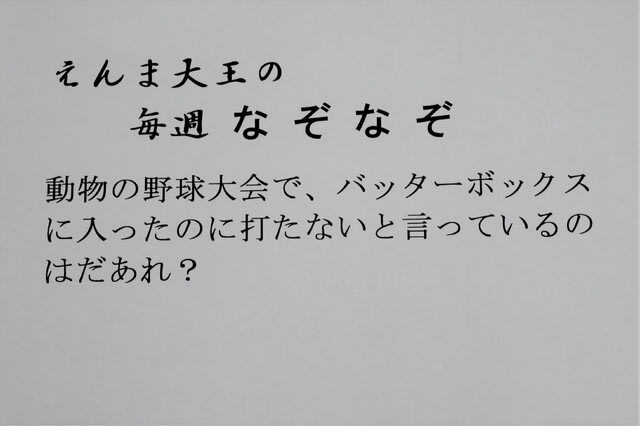 月曜日に貼り替えるはずの「毎週なぞなぞ」だが、あまり風か強く、掲示板を開けると扉の蝶番が壊れそうなので明日に延期した。答 ...