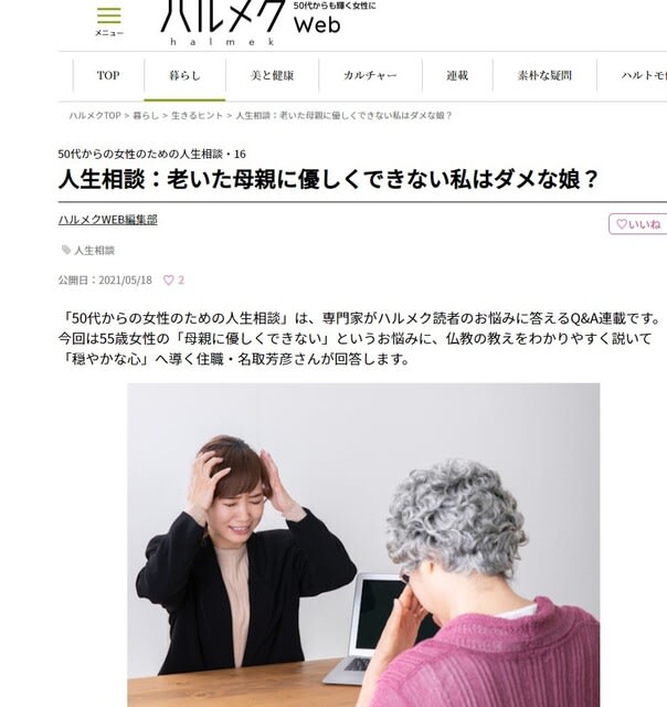 今月担当したハルメク(ウェブ版)の人生相談は「老いた母親に優しくできない私はダメな娘?」。https://news.ya ...