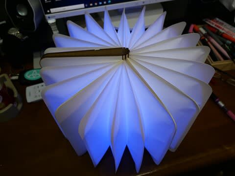 実にユニークだと思って買った本型のLED照明。開くと電気がつき、360°まで開く(写真)。色は4色の中からボタン ...