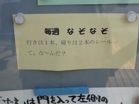 毎週月曜日は掲示板の「なぞなぞ」交換日。今日の「行きは1本、帰りは2本のレールって、な~んだ?」は30年ほど前から答えを ...