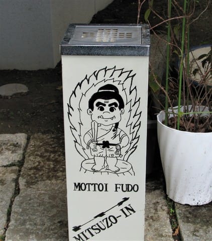 屋外の吸殻入れに、密蔵院本尊のキャラクターのお不動さまをマジックで書いてから30年。劣化したのでマジックでなぞり、リニュ ...