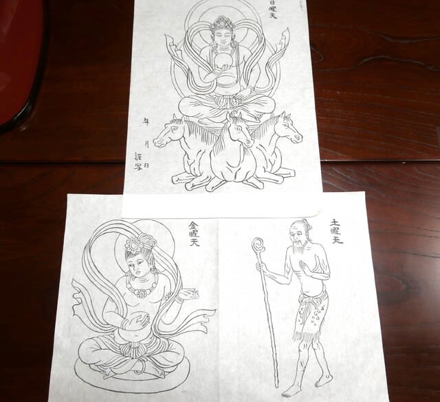 法事を終えて、来年の「写仏の庭」のお手本描き。曼荼羅には七曜も入っているのだが、さて、どうして日曜が三頭の馬に乗っている ...