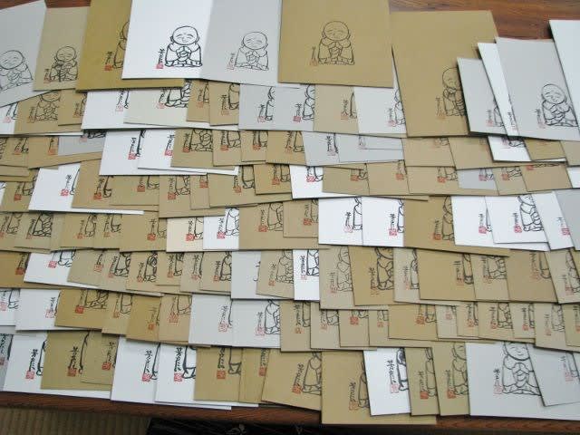 ざっと150枚ほどお地蔵さまを厚紙に描いたので、押したハンコを乾かしている図である。ここから、ヨダレカケに色を入れて、そ ...