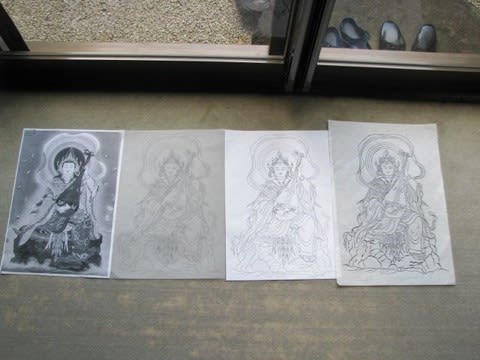 ステキな仏画(一番左)を見つけると、トレーシングペーパーに鉛筆でトレース(左から二番目)。それをコピーして(左から3番目 ...