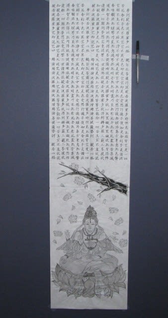 大きさを分かりやすくこのために右上部に筆ペンを置いてみた。心経二巻と花散る中に座す般若菩薩(?)の力作。刑期が残り一年あ ...