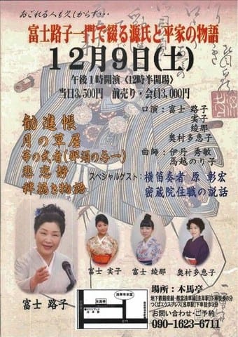 時は来週、師走9日13時。ところは浅草木馬亭。富士路子(日本浪曲協会会長)一門による『源氏と平家の物語』。たっぷり浪曲四 ...