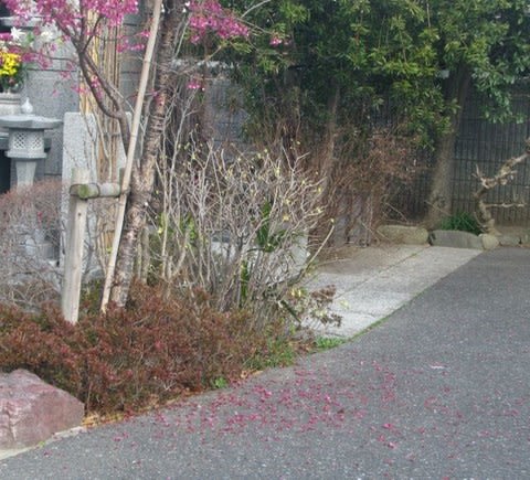 地に散り敷きて璧(たま)となれ ※写真は境内にある今日の釣鐘桜。