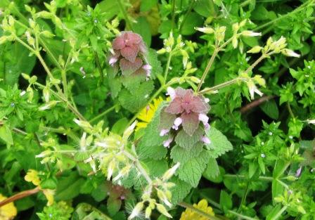 密蔵院前の歩道の茂みに生えている草は、葉が大から小へと重なって、さらに階層の間に小さな紫の花が咲いている。地べたにいる虫 ...
