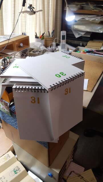 原稿執筆の合間に行う「日めくり」作りは、最初に10冊単位で日にちだけ書き込む。それを乾かすために筒型ウェットティッシュの ...