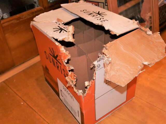こんな破き方(写真)は、人間にはできない。台所のテーブルや椅子の脚は、まだ無事である。あはは。