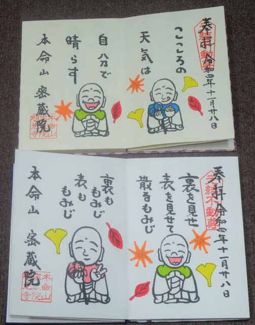 今月のご朱印は落ち葉(の絵)を散らして描いている。今日、ご詠歌の見学にいらっしゃった方のご朱印帳に描いたら、古参の講員さ ...